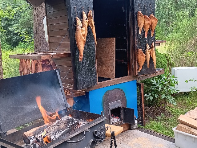 Was nicht frisch verwendet wird, wird in vielen kleinen Fischräuchereien, oft Einmannbetriebe am Rand von Touristenattraktionen wie hier nahe am Strand auf der kurischen Nehrung, zu Räucherfisch – hier Zander – verarbeitet und oft noch vor Ort von Einheimischen und Touristen verspeist