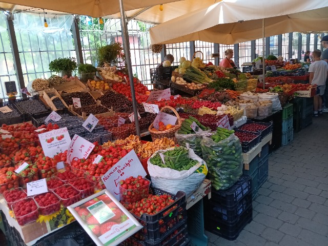 Im Juli bieten die Märkte, hier z.B. in Vilnius, viele bekannte Gemüse und -obstsorten, die die Balten lieben, diverse Sorten Beeren und Pilze, vor allem Pfifferlinge, und frühe Kirschen. Da Obst- und Gemüseanbau in Litauen begrenzt sind, werden viele Waren z.B. aus Polen und der Türkei importiert