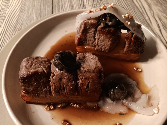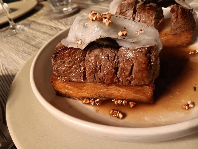 Der absolute Knüller war das vor dem Grillen schon in grobe Würfel geschnittene Rinderfilet, medium gegart, hier im Anschnitt gezeigt. Es wurde auf Mille Feuille von der Kartoffel und unter einer Lage besten Lardoschinkens mit leicht karamellisierten Nussstückchen auf je 2 Schnecken auf den 2 Tranchen serviert. Angenehm fiel auch der junge, pragmatisch-professionelle Service auf. Hervorragend!