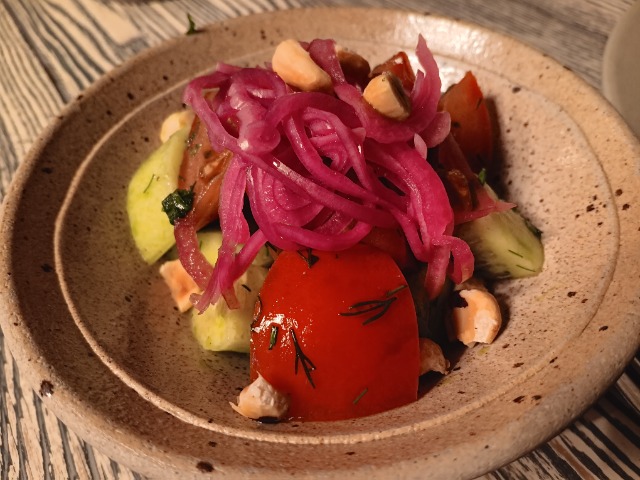 Beim Salat wurden viele in Litauen (wie auch hier oder im Balkan) bekannte Zutaten wie topfrische Tomaten und Gurken als Basis miteinander kombiniert. Verfeinert wurde der Salat mit in Roter Bete marinierten und gefärbten Zwiebeln und als Crunch mit ein paar sanft gerösteten Nüssen