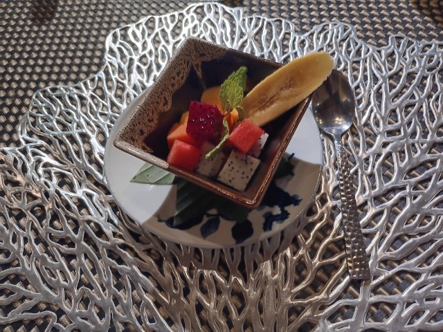 Beim Dessert gab die Küche noch einmal alles, speziell beim Anrichten: Mit Reiswein marinierter Obstsalat mit akkurat geschnittenen Stückchen und etwas Minze als Dekoration. Frische Früchte aus lokalem Anbau bzw. der Region sind geschmacklich nicht zu übertreffen