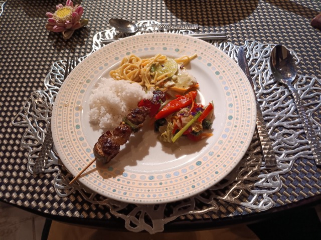 Wie üblich in Kambodscha werden zum Hauptgang mehrere, verschiedene Gerichte gereicht, in diesem Fall ein lecker marinierter, gebratener Fleischspieß mit Pfeffersoße, gedämpfter Flussfisch, Eiernudeln mit Dressing nach Art des Hauses und pfannengebratenes Gemüse, fein mit Sojasoße abgeschmeckt. Prima!