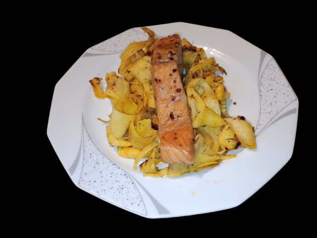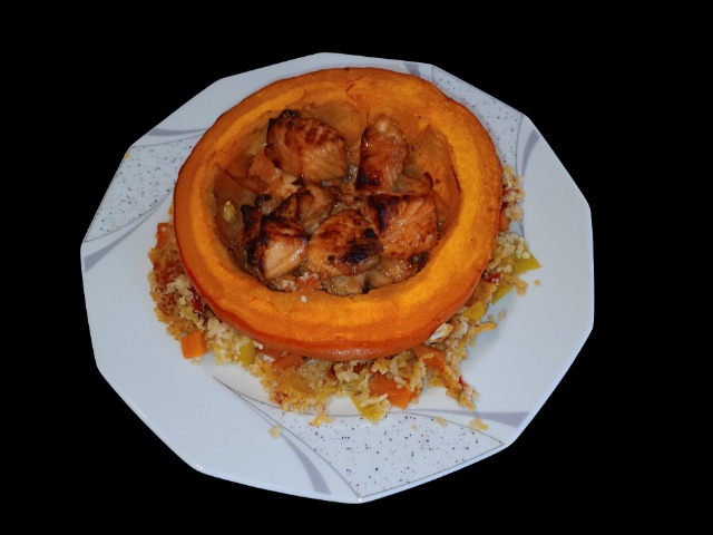 Vorgedämpfter, halbierter und entkernter Hokkaido gefüllt mit 3-Tassen-Lachs (Sojasauce, Reiswein, Zucker), gewürzt mit mit Knoblauch, Ingwer und Koriander. 12 min bei 180 °C im Airfryer, und schon ist ein leckeres Essen fertig