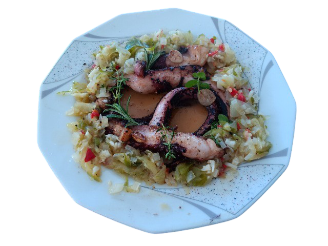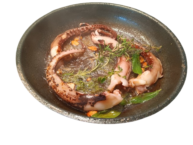 Sanft (!) gegarte, frische oder tiefgekühlte Oktopustentakel im bereits erhitzten Olivenöl-Kräuterbad jeweils nur 2-3 min bei mittlerer Hitze (z.B. Stufe 6 von 9) anbraten. Die Knoblauchscheiben mit den Tentakeln in die Pfanne geben, damit sie nicht bitter werden
