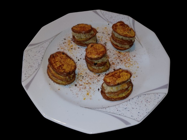 Partyhäppchen aus 3 mm dünnen, rohen, frittierten Kartoffelscheiben: Füllung ist eine Creme aus gegarter Aubergine, rohen Zwiebeln, Knoblauch und Kreuz-kümmel. Zum Würzen/ Garnieren: Salz Pfeffer, Curry und Paprika