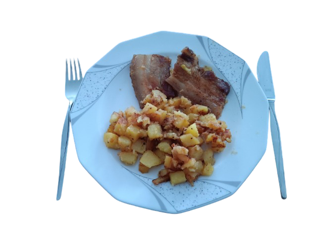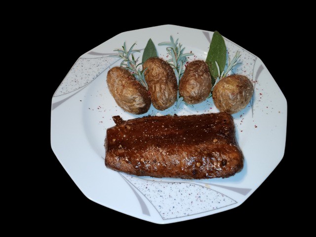 Der Kick bei dem geknusperten Schweinebauch liegt im schonenden Garen (Sous-vide oder NT bis zu einer Kerntemperatur von ca. 75 °C) und 10 min (190 °C) oder 12 Minuten (180 °C) im Airfryer. Die vorgegarten, gesalzenen und gepfefferten Kartoffeln können mitgegart werden. Bräunung und Geschmack hängen von der Glasur ab (Salzwasser oder Honig-Sojasauce)