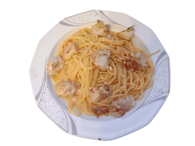 Der Bacon wird kleingeschnitten und ausgelassen. In dem Fett und etwas zusätzlicher Butter wird der gewürfelte Kabeljau angebraten und in etwas Wein kurz geschmort. Mit Salz, Pfeffer und etwas Chili gewürzt, wird er über Spaghetti angerichtet