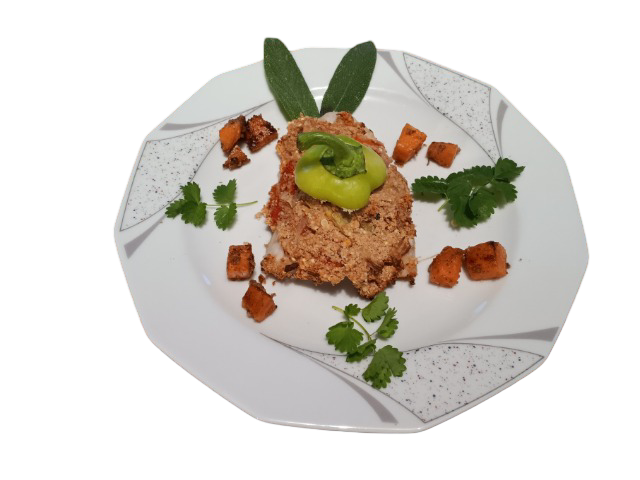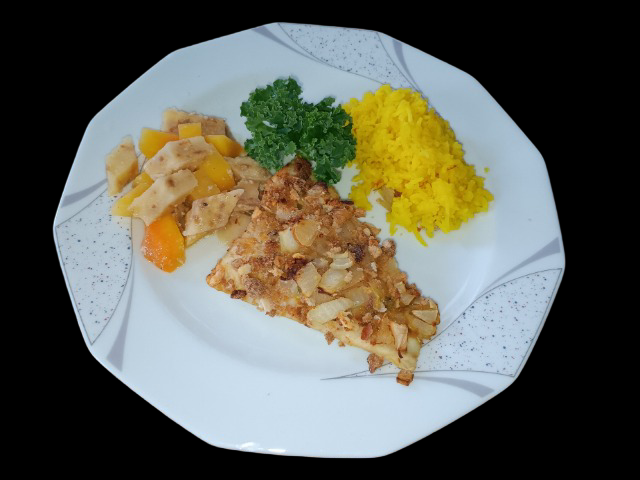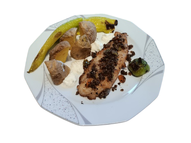 Hirse und Couscous werden in selbst gemachter, frischer Gemüsebrühe weich gekocht. Die abgepresste Masse (Gemüse, Gräser) wird mit orientalischer Gewürz-paste gewürzt, geformt und auf den Fisch platziert. Der Fisch gart in ca. 12 min bei 180 °C in der Heißluftfritteuse