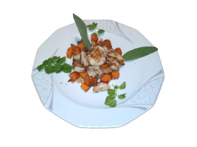 Das Pangasiusfilet wird zu Würfeln geschnitten und in Semmelbröseln gewälzt. Zusammen mit gewürfelten, bereits zu 3/4 vorgegarten Süßkartoffeln werden sie in der Pfanne in Butter und Olivenöl bei mittlerer Hitze vorsichtig gegart, damit der Fisch nicht zerfällt