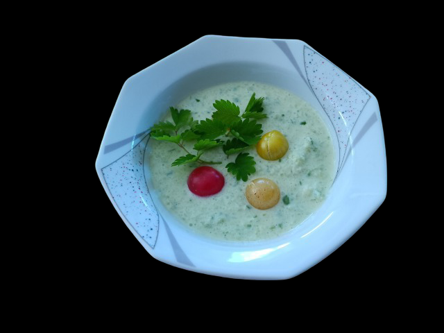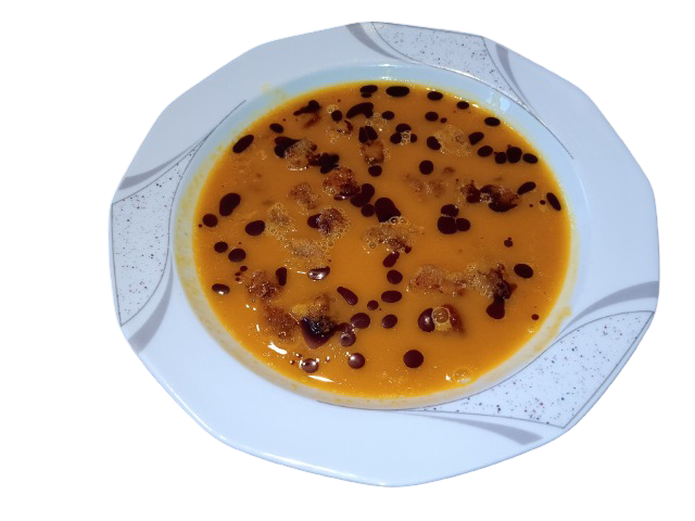 Ein zuvor im Ganzen gedämpfter Kürbis wurde in einer Brühe aus frisch gemahlenen, asiatischen Gewürzen (ca. 1 EL pro l Wasser), d.h. Anis, Curryblättern, Kaffirlimettenblätter, Kardamom, Kreuzkümmel, Kurkuma und Zimt nach dem Teilen in grobe Stücke fertig gegart, püriert und mit Kürbiskernöl garniert