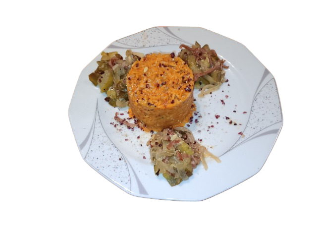 Aus frischen Auberginen, Zucchini und Tomaten aus dem Garten wurde eine sämige, prächtig gefärbte Gemüsebrühe gekocht. In 5 Teilen der Brühe wurde unter ständigem Rühren 1 Teil Basmatireis gegart. Snackgurken wurden mit Zwiebeln und Speck angeschwitzt und mit wenig Wein geschmort. Dekoriert wurde mit selbst gemachtem Brombeersalz und weißem Kampotpfeffer