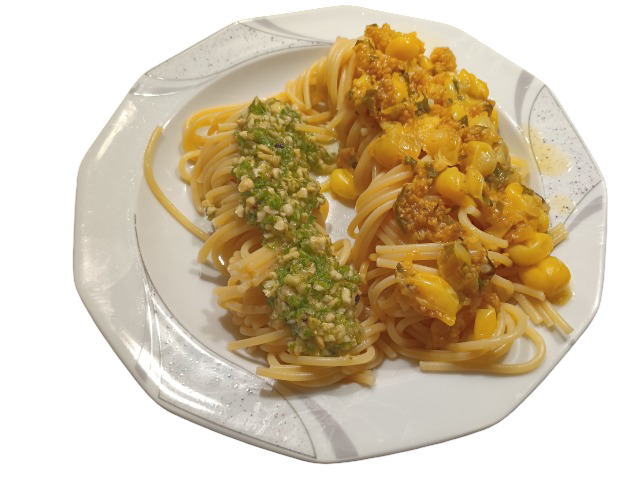 „Nudeln gehen immer“. Frische Tomaten und Zucchini werden klein geschnitten und mit frischen, gehackten, mediterranen Kräutern und Chilis nach Gusto zu einer breiartigen Konsistenz verkocht. Salz und Pfeffer dazugeben und idealerweise mit farbigen Nudeln (Sepia, Spinat, Safran) kombinieren