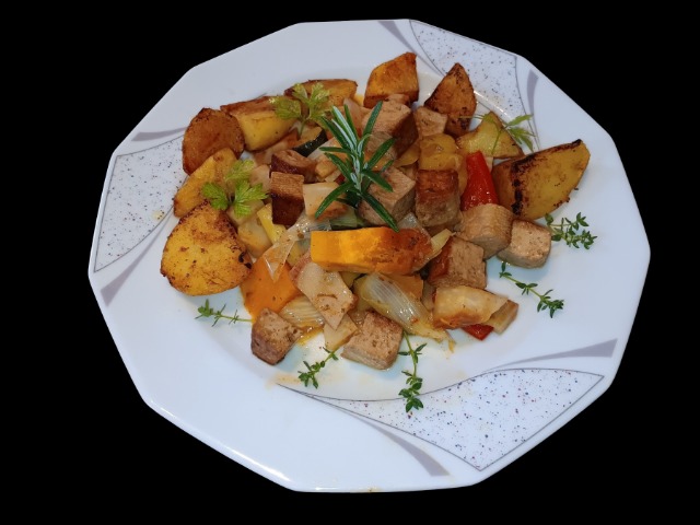 Mittelfest kochende Kartoffeln werden zuerst bei NT gegart und später in wenig Öl bei mittlerer Temperatur rösch gebraten. Sie begleiten mariniertes Mischgemüse und Tofuwürfel, beide zuerst angebraten und dann gedünstet