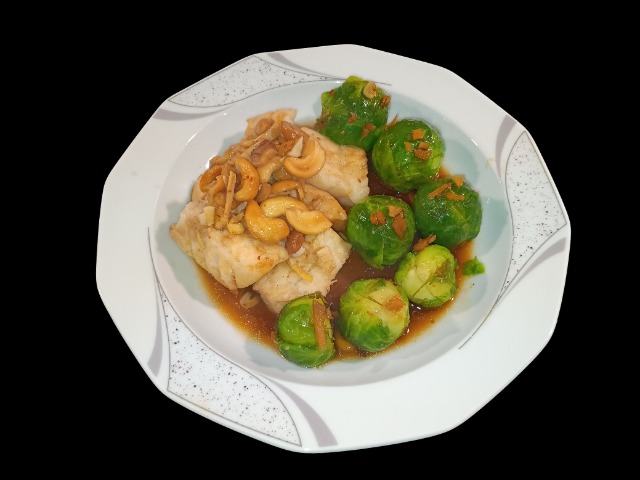 Endlich gibt es auch den lange ersehnten Rosenkohl, am liebsten gedämpft und noch knackig. Er bildet einen schönen Kontrast zum gebratenen, weißen und weichen Kabeljau sowie zu den braunen, angerösteten Cashews