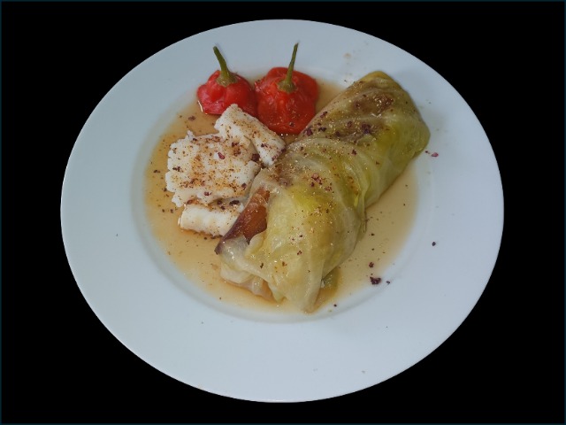 Angebraten und zerkleinert als Füllung für die geschmorte Kohlroulade kommen 2 Varianten von Kabeljau auf den Teller. Pikant wird das Gericht durch 2 gedämpfte, mit ihrer Farbe – aber auch Schärfe – begeisternden Glöckchenchilis