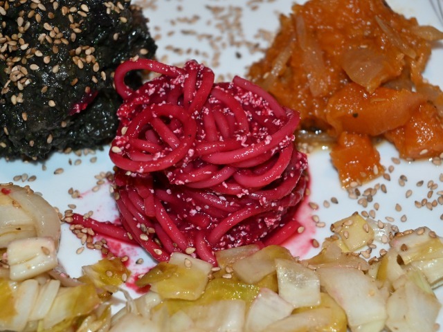 Spaghetti in Rote-Bete-Granatapfelsaft gegart