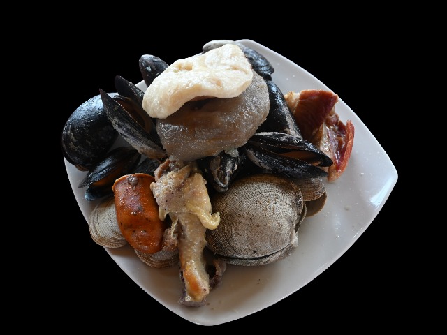 Fleisch, Geflügel, Fisch und viele Muscheln werden in einem leicht gesalzenen Fisch-Muschel-Sud ohne viel Gemüse gegart und mit einheimischen Brotsorten als Eintopf serviert. Voller Geschmack!