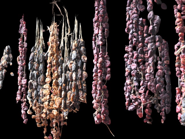 Aufgrund der 4.000 km langen Küsten-linie sind Fisch und Meeresfrüchte in Chile Alltag. Zum Konservieren trocknen Chilenen geschälte Muscheln in der Sonne (salzen sie z.T.) und fädeln sie sehr dekorativ zu Zöpfen auf – ein Blickfang