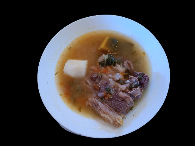 In einer Gemüsebrühe werden wenig Gemüse, z.B. Kürbis, Rind- oder Schweine-fleisch am Knochen, große Stücke Kartoffeln und halbierte Maiskolben lange gegart, ebenfalls kaum gewürzt und als dennoch schmackhafte Suppe angeboten