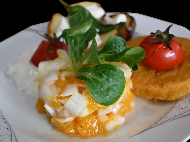 Mischgemüse aus Steckrübe und Sellerie begleitet „Zander Strindberg Art“: Das Zanderfilet wird mit einer Kruste aus vorgegarten Zwiebeln, Senf und wenig Semmelbröseln versehen und 10 min in der Heißluftfritteuse gegart