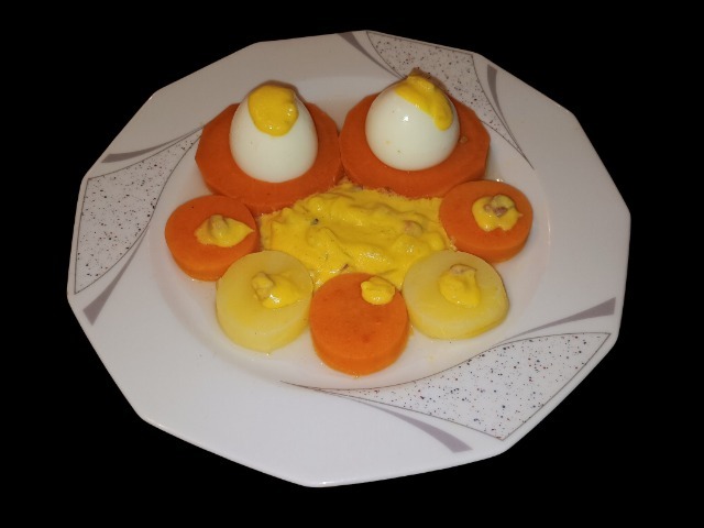 Klassische Senfsauce mit Speckwürfeln wird auf gekochten Eiern drapiert, die in ausgestochenen Salz- bzw. Süßkartoffel-scheiben sitzen. Darum herum werden die Kartoffelringe gesetzt und jeweils mit einem Klecks Senfsauce versehen