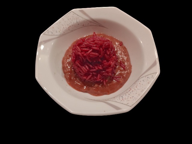 Roter Reis ist ein Hingucker und, in süßem Granatapfelsaft (4 Teile Saft auf 1 Teil Reis) gekocht, schön fluffig. Getrocknete Datteln werden in Joghurt püriert, um ein orientalisches Dessert abzurunden. Süß, besonders, lecker!