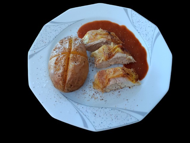 Brathähnchenbrust, Ofenkartoffel und Jus