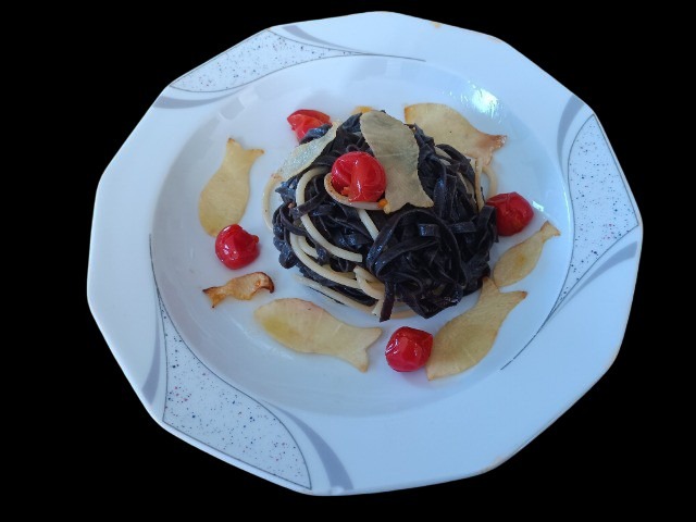 Getrennt voneinander gekochte Sepiaspaghetti und normale Spaghetti werden mit Servierring oder Fleischgabel ineinander verdreht. Garniert werden sie mit dünnen, ausgestochenen, kurz frittierten, gesalzenen und gepfefferten Kohlrabischeiben und in Olivenöl und Kräutern confierten Cherrytomaten