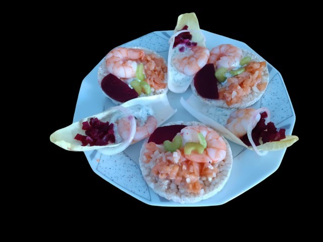 Rote Bete, Tomatensalsa, gesalzene Gurkenstückchen und Garnelen werden auf Chicoree-Schiffchen und Reis- oder Maiswaffeln gesetzt. Ggf. kann ein leichtes Dressing nur auf die Schiffchen gegeben werden. Die Waffeln würden durchweichen. Die Häppchen sind schnell gemacht, z.B. für spontane Gäste