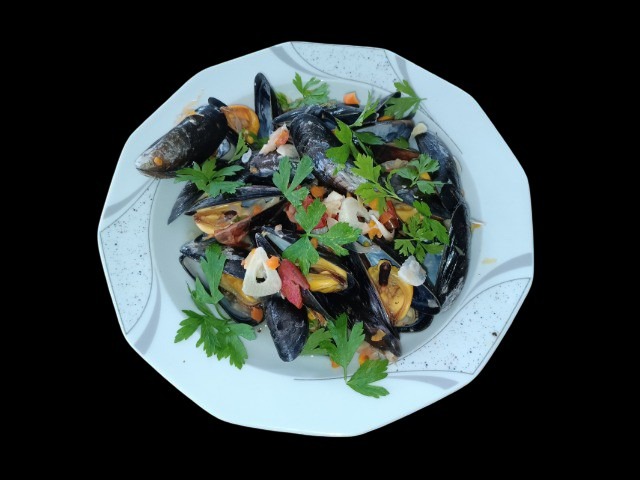 Klein geschnittenes, saisonales Gemüse, Knoblauch und Zwiebeln in Scheiben werden in je 50% Weißwein und Wasser mit einem Kräutersäckchen gegart. Die geputzten Muscheln dazugeben, bis sie sich geöffnet haben (ca. 3 min). Im tiefen Teller mit Petersilie anrichten