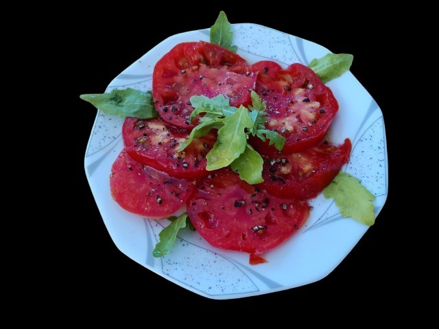 Ochsenherz- oder Fleischtomaten eignen sich m.E. bestens für Tomatensalat. Noch knackige Tomaten lassen sich mit der Maschine oder einem scharfen Messer gut in gleich dicke Scheiben von ca. 4-5 mm schneiden. Balsamico, Olivenöl, Salz, Pfeffer und als Kontrapunkt ein Spritzer Ahornsirup oder Honig dazu. „Einfach“ toll