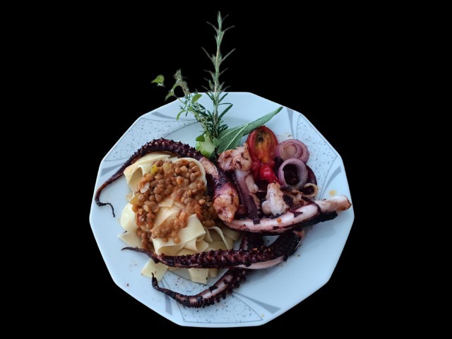 Bandnudeln mit gekochten Linsen, geschmorten Zwiebeln und confierten Cocktailtomaten begleiten vorgekochte und kurz (!) in der Pfanne gebratene Oktopustentakel zu einem geschmack-lichen und optischen Genuss