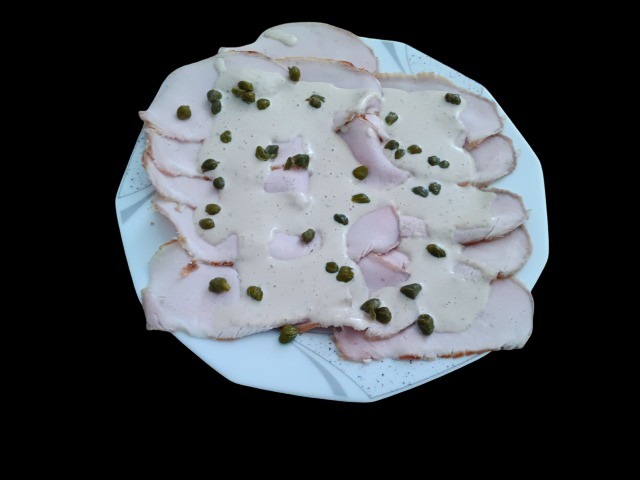 Schweinerücken wird zunächst NT-gegart (Kerntemperatur 60 °C). Nach ein paar Stunden im Kühlschrank wir der mit der Maschine in 2-3 mm starke Scheiben geschnitten und gefächert. Dazu wird eine klassische Vitello-Tonnato-Sauce als „Eintopfvariante“ im Mixer zubereitet