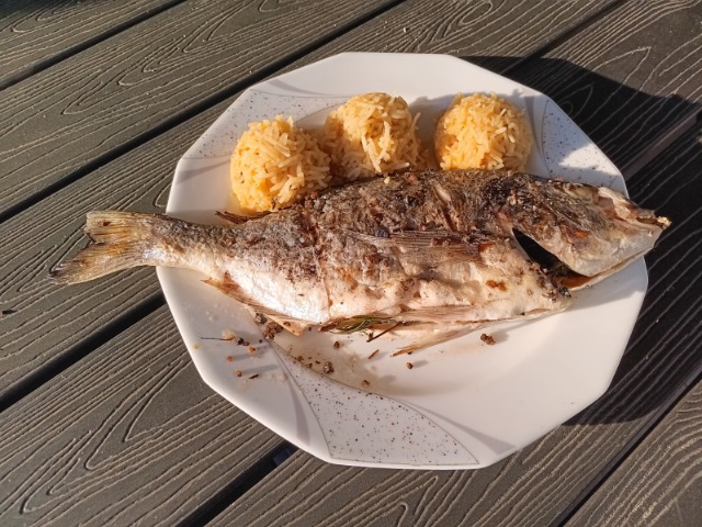 Wer kennt es nicht, den Ärger mit Fisch vom Grill, der gerne auch an an sich inerten Materialien anhaftet? Ein Weg, der sich bewährt hat, ist ein simpler Pizzastein statt eines gusseisernen Grills. Anstatt zu ölen, hilft eine dünne Schicht Salz auf dem Pizzastein, auf der z.B. die hier mit Kräutern gefüllte Dorade gegrillt wird. Grill- und Ruhezeiten von ca. 15 min sprechen für die Nutzung der Kochplatte oder – bei entsprechend Platz auf dem Grill – für das Kochen der Beilage, hier Gemüsereis, auf dem Grill selbst